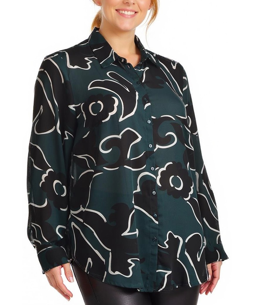 Дамска риза с абстрактен флорален принт в тъмнозелено, черно и бяло. Спокойна кройка, копчета предно закопчаване, дълъг ръкав и блестящ, лек, сатенен ефект – елегантна и комфортна. За всеки ден и офис..
