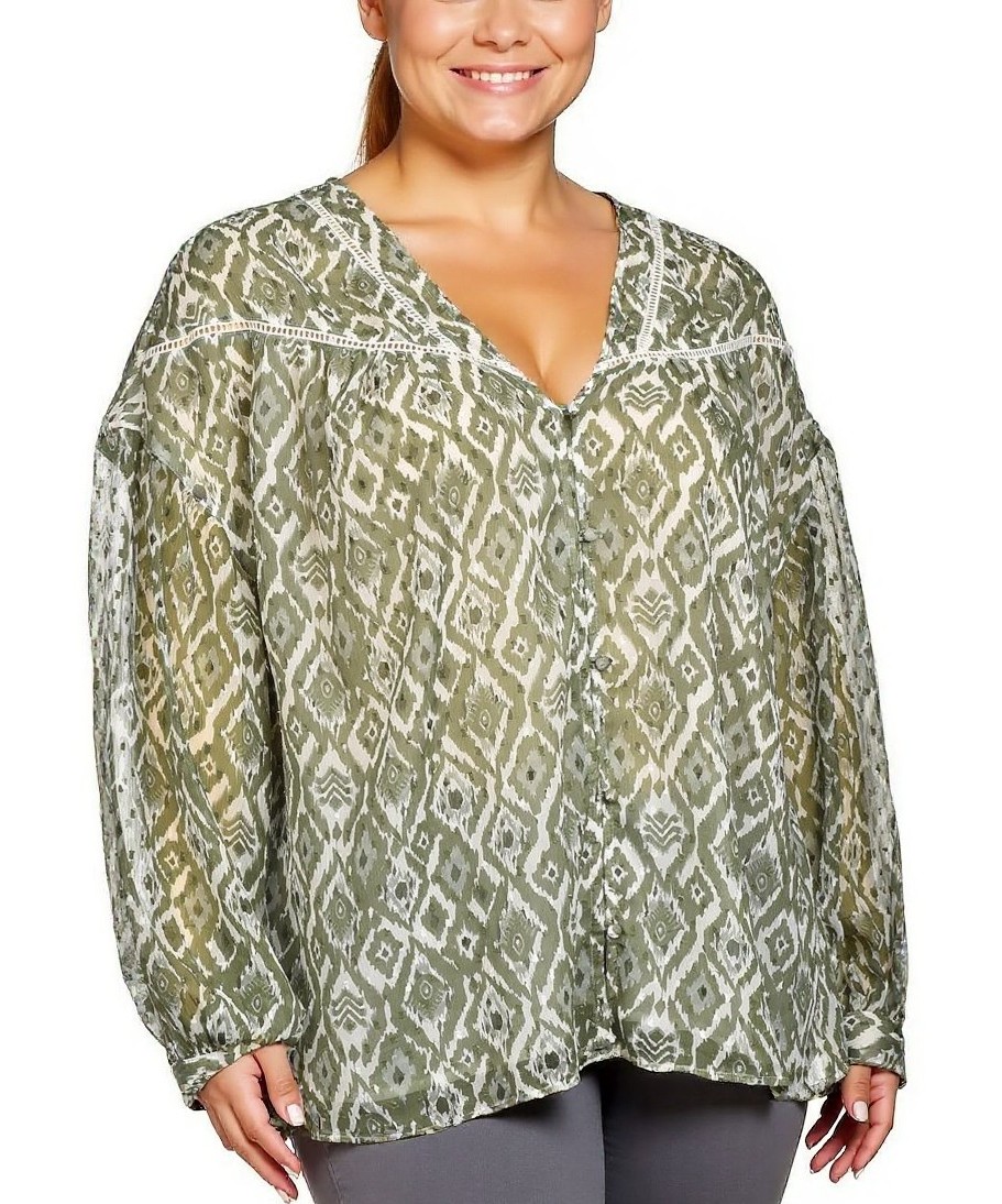 Дамска риза с ефирен дизайн, изработена от лека материя в зеленикав и бял мотив. Ризата е с дълги ръкави и V-образно деколте, подчертана с ажурни детайли за стилен и удобен ежедневен вид.