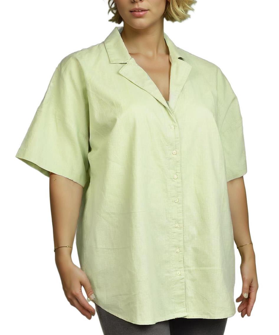 Елегантна дамска риза от ленена смес с памук в свеж светлозелен нюанс. Има класическа яка и свободен, комфортен силует. Перфектна за ежедневна употреба или офис облекло, добавя стил и лекота.