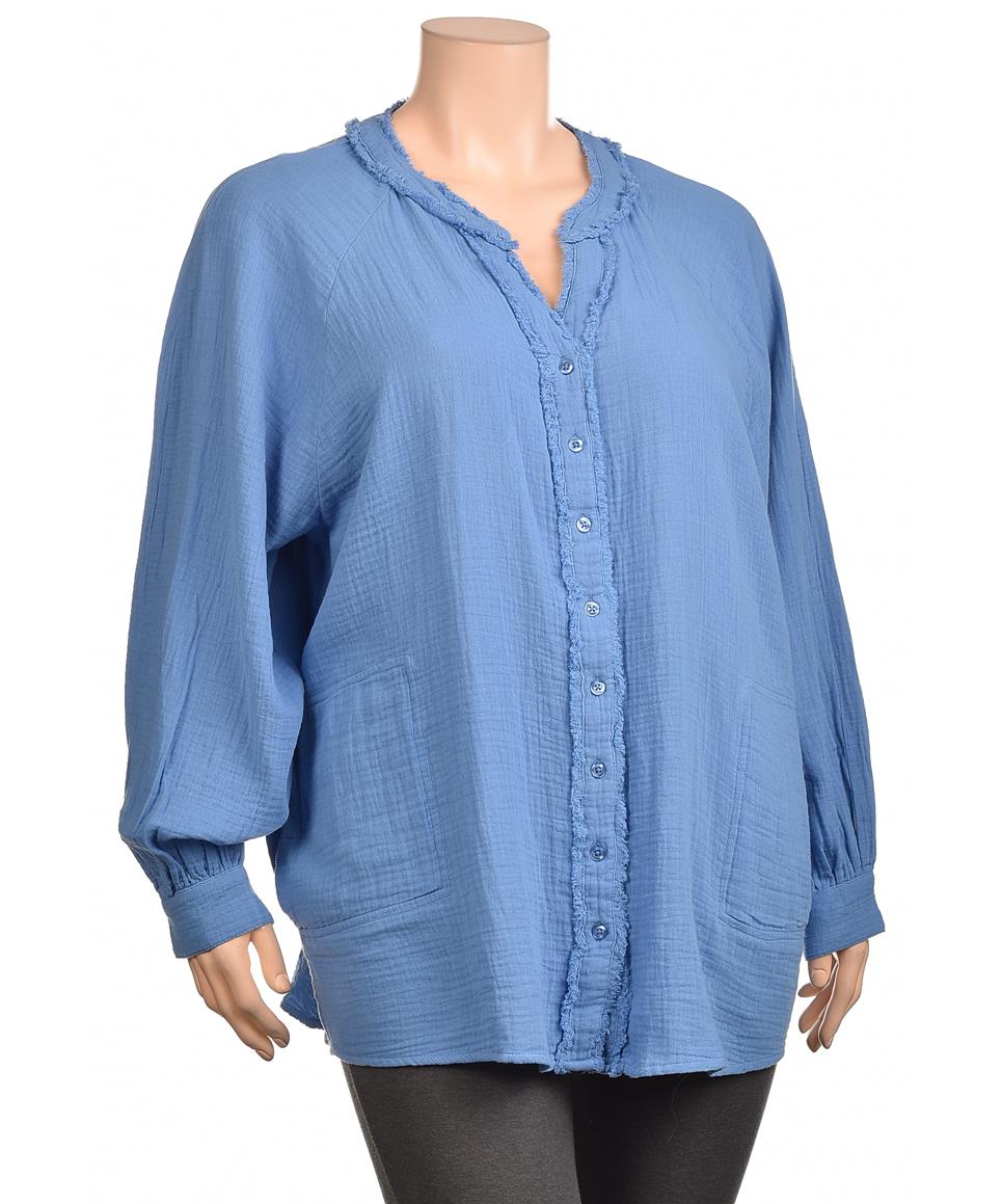 Дамска риза от 100% памук в светлосиньо. Свободен, лек силует с копчета, дълъг ръкав с маншет, два джоба и фина набрана декорация. Мека, дишаща и лесна за поддръжка. Перфектна с дънки или панталон XL.