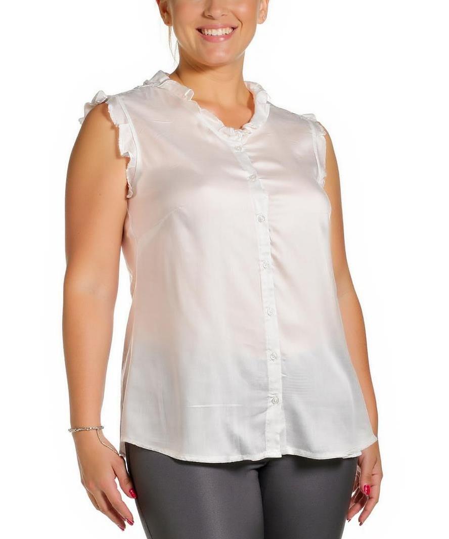 Елегантна дамска риза без ръкави в нежно бяло. Лека и мека материя, свободна кройка за комфорт. Закопчаване с копчета отпред, фин волан около врата и раменете. Подходяща за работа и ежедневие. Удобна!