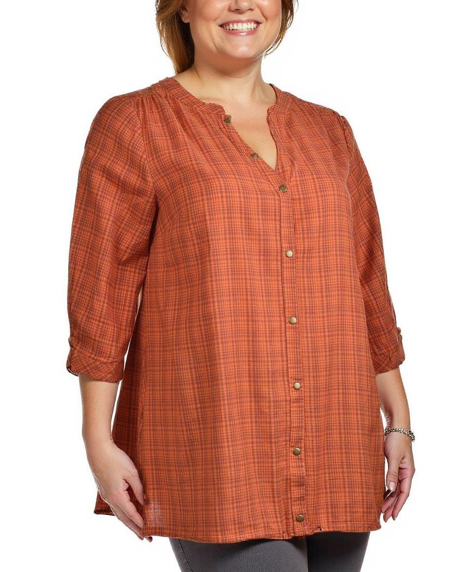 Дамска риза с дълъг ръкав, изработена от мек памук. Дизайнът е в оранжев кариран мотив с копчета отпред. Подходяща за ежедневието, риза предлага комфорт и стил. Идеална за комбинация с дънки или панталони.