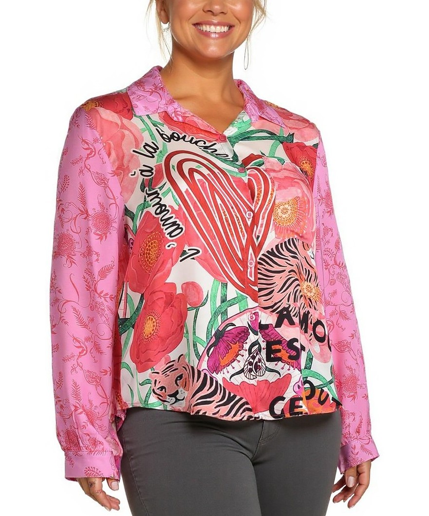 Дамска риза от мека ВИСКОЗА с дълъг ръкав и яка. Ярък принт с цветя, сърце и тигър. Закопчаване с копчета, свободна линия за комфорт. Подходяща за ежедневие и смели визии. Лека и дишаща материя.