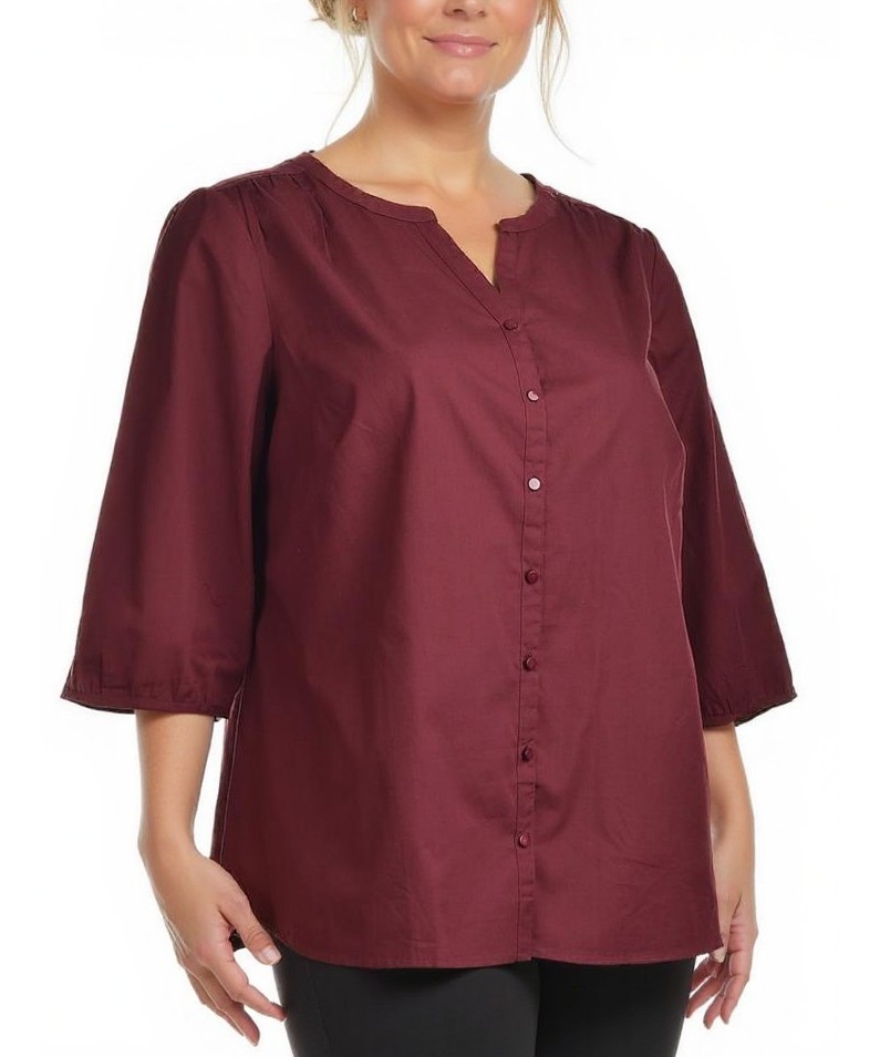 Дамска риза от 100% памук в стилно бордо. Свободна кройка, три-четвърт ръкави, V-образно деколте и закопчаване с копчета отпред. Мека, дишаща и лесна за поддръжка. И перфектна за офис и свободно време