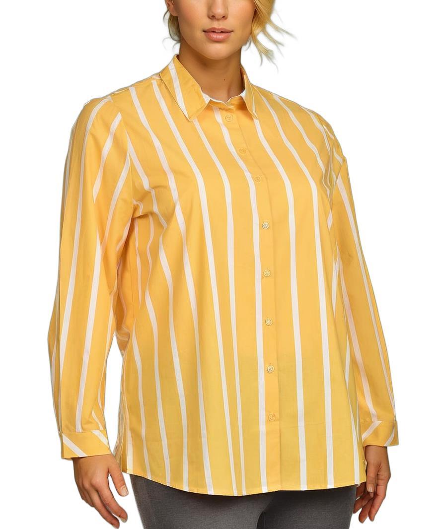 Дамска риза с дълъг ръкав в свеж жълт цвят с бели вертикални райета. Изработена от мек памук, тя е удобна и стилна, идеална за ежедневна визия или официални поводи. Класически дизайн с копчета.
