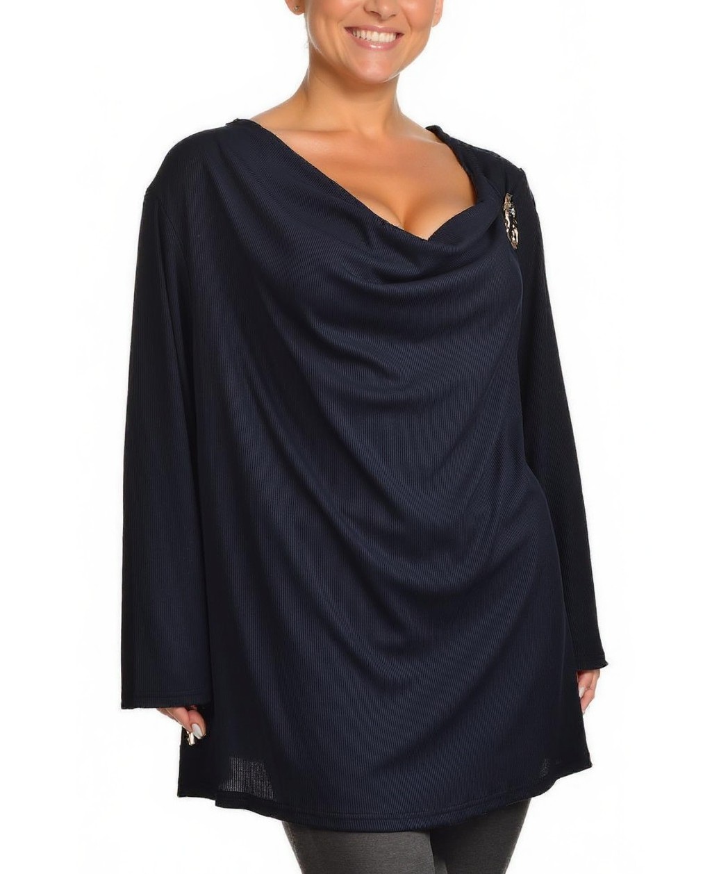 Дамска туника тъмносиньо, свободен силует с ефектно водопадно деколте и дълги ръкави. Елегантна и удобна, с брошка на рамото, подходяща за ежедневие и специални поводи. Лека и дишаща, лесна поддръжка