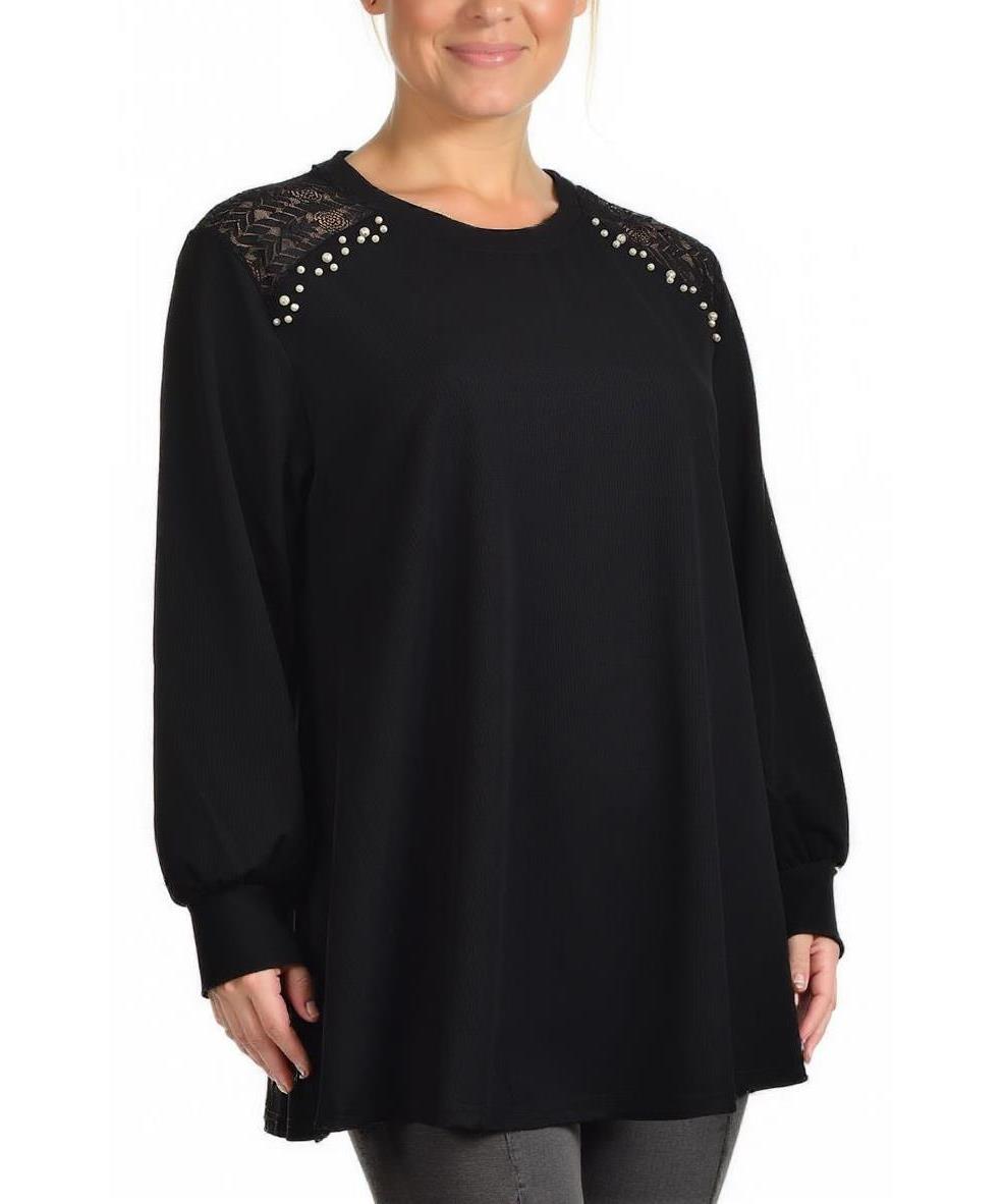 Елегантна дамска туника в черно, свободен силует, дълги ръкави с ластични маншети, дантелени детайли на раменете и декоративни перли. Мека, подходяща за ежедневен и официален стил. Удобна и практична.