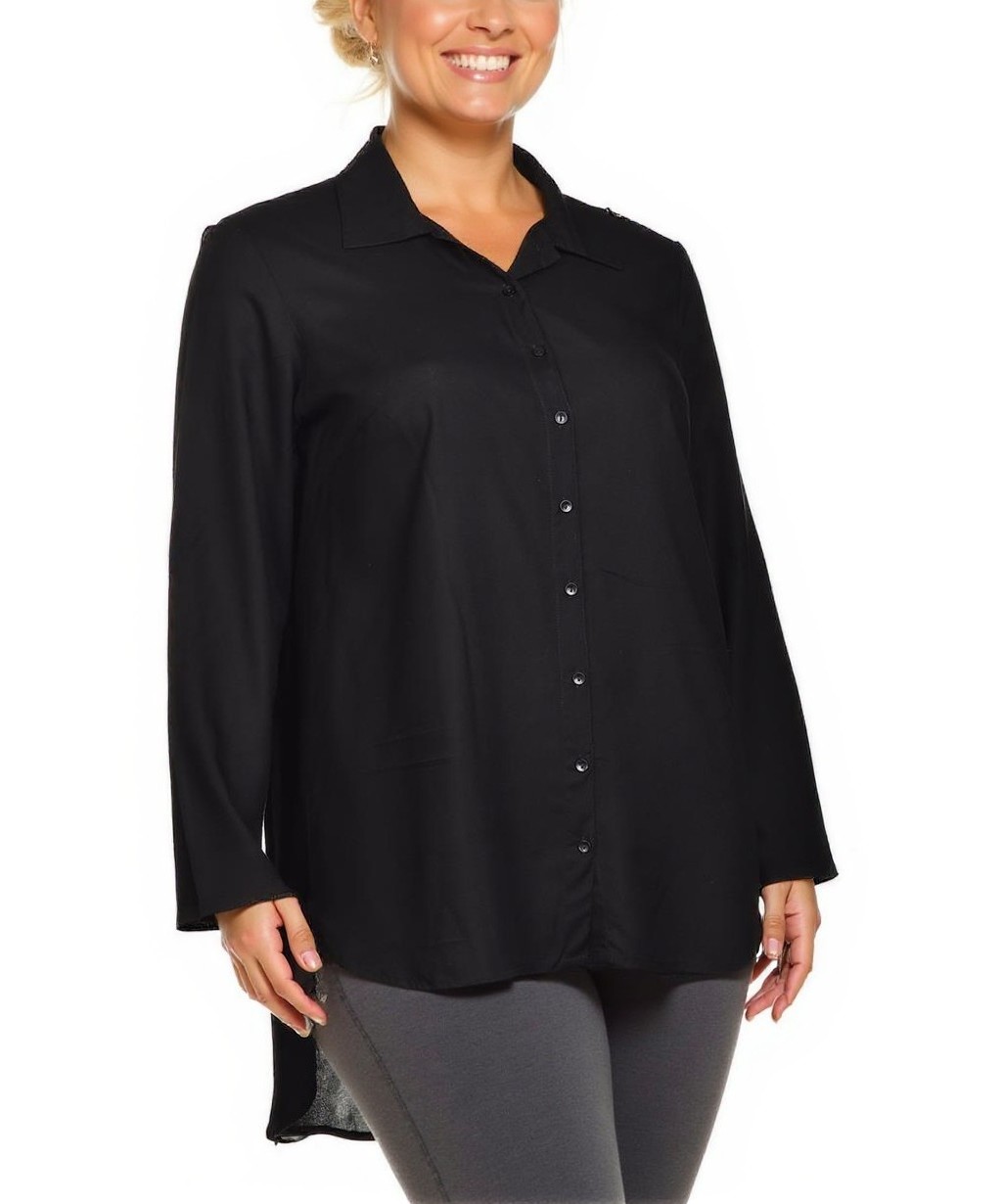 Елегантна дамска туника от вискоза в черно. Свободен силует, риза с копчета, дълги ръкави и удължен гръб. Мека, дишаща материя за комфорт през целия ден, подходяща за офис и свободно време. Подходяща