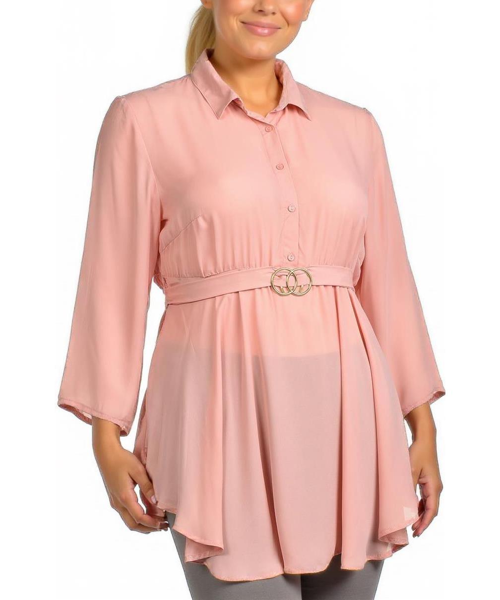 Елегантна дамска туника в прасковено розово, с яка и копчета, разкроен силует и дълги ръкави. Лека ефирна материя и тънък колан с метална халка подчертват талията. Подходяща за всеки ден. Супер избор!