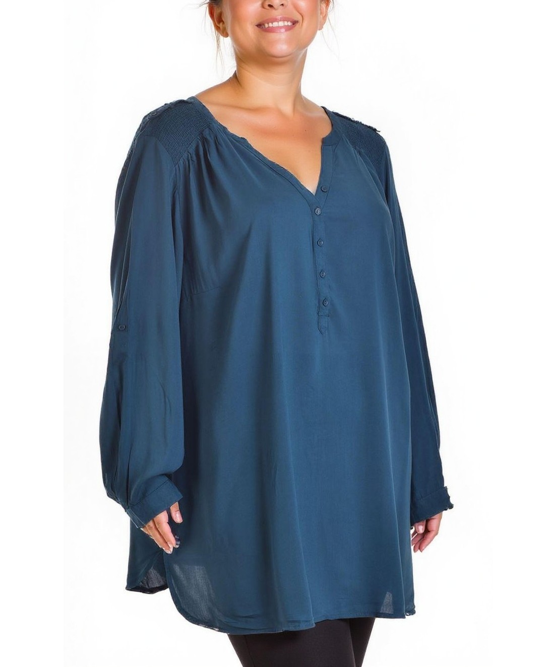 Дамска туника от вискоза с V-образно деколте и копчета. Свободен, лек силует с дълги ръкави и маншети, събрани рамене и удължен гръб. Дишаща, удобна и стилна за всеки ден. Подходяща за всеки ден.