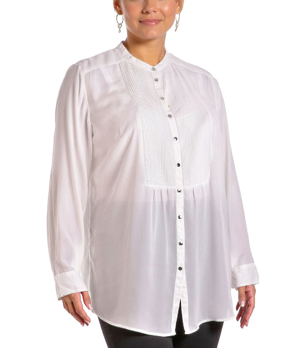 Елегантна бяла дамска туника с дълъг ръкав, прав силует и копчета отпред. Фин плисиран бюст, стояща яка и свободна кройка. Лека и универсална за офис и ежедневие. Подходяща за всеки ден, лесна грижа!!