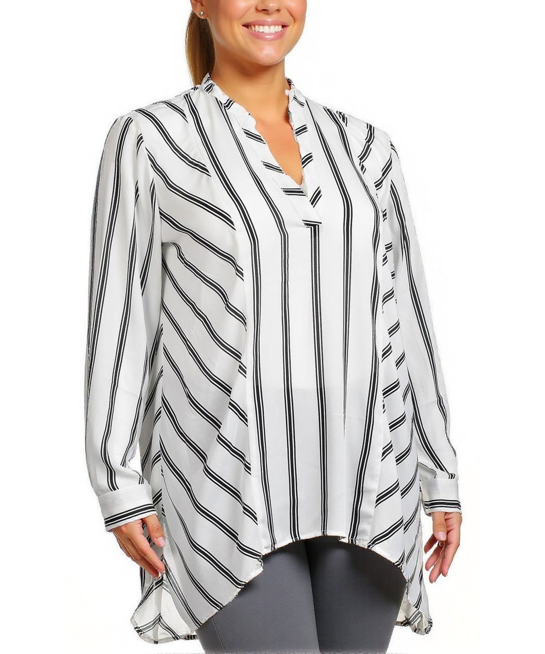 Елегантна дамска туника в бяло с тънки черни райета. Свободен силует, V-образно деколте, дълги ръкави и асиметричен подгъва. Лека, ефирна материя – идеална за ежедневие и офис. Идеална за всеки ден!!!