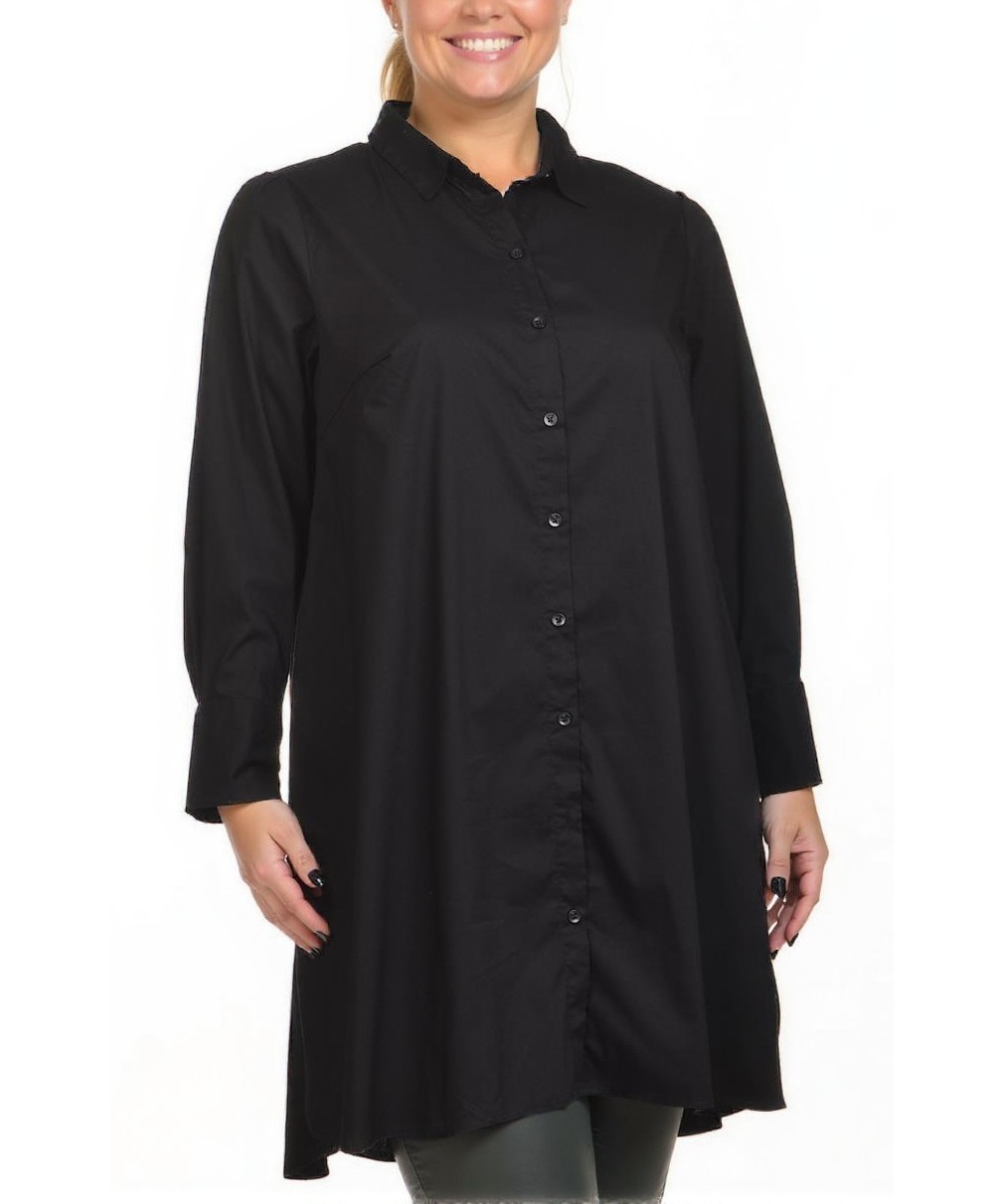 Елегантна дамска туника от памук в черно. Свободен силует с копчета отпред и класическа яка. Дълги ръкави, мека и дишаща материя, идеална за ежедневие и офис комбинации. Подходяща за всички сезони. XL