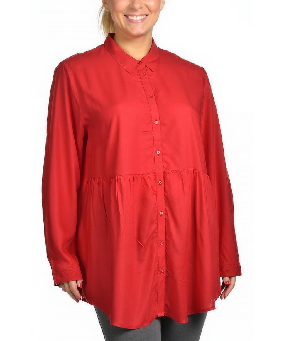 Червена дамска туника от вискоза с копчета, дълги ръкави и свободна, разкроена линия с малки къдрички под бюста. Мека, дишаща материя, елегантна и удобна за всекидневно и офис носене. Лесна поддръжка!