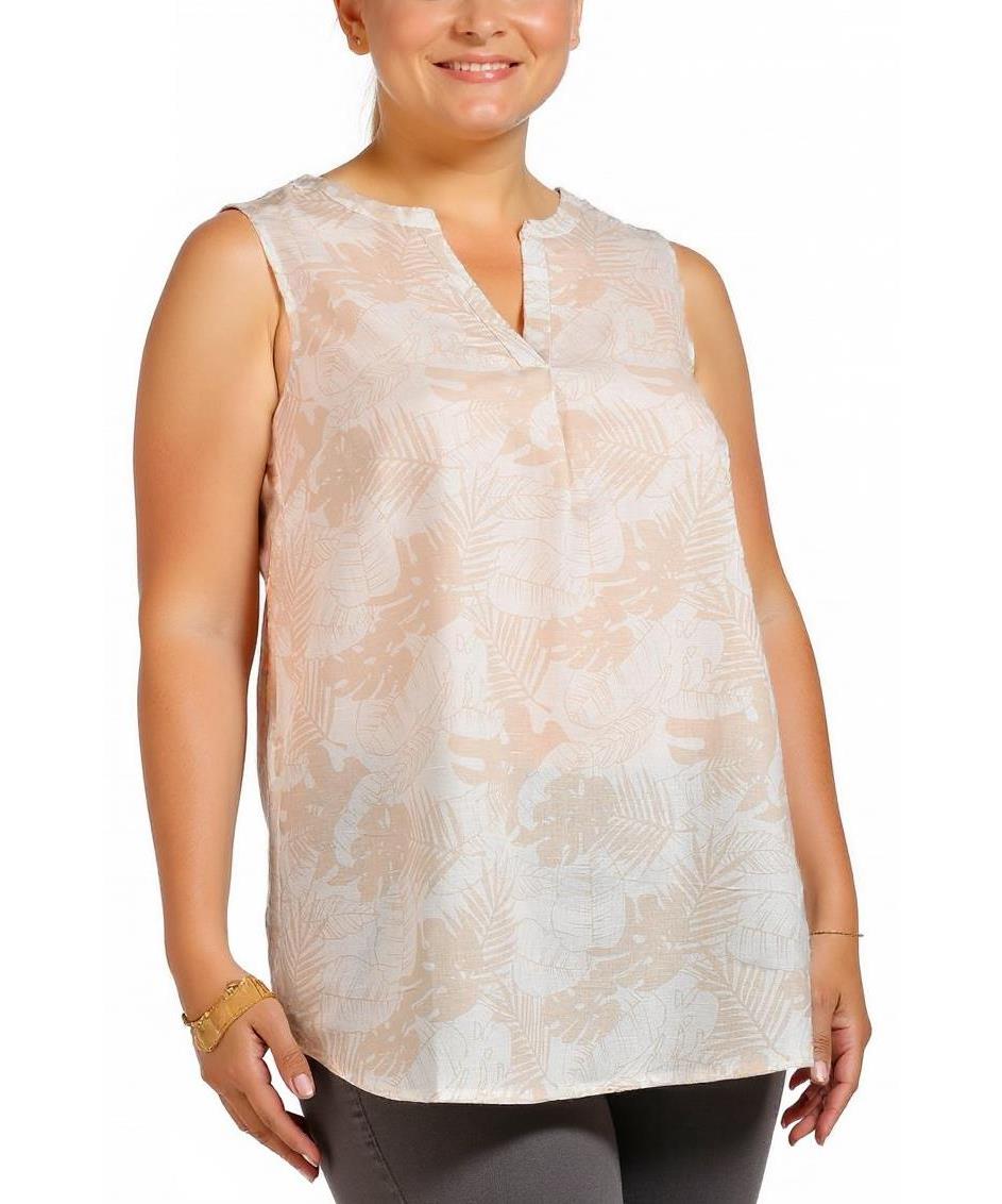 Дамската туника от ленена смес е лека и удобна, подходяща за летните дни. Тя е в нежен бежов цвят с листен принт и има свободен силует без ръкави за максимален комфорт и стил. Идеална за ежедневна визия.