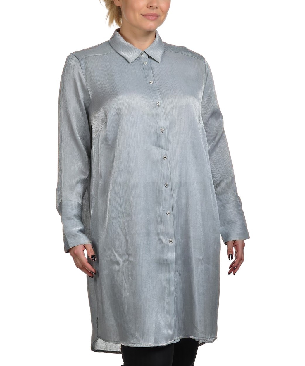 Стилна дамска туника от вискоза в мек сив металик. Свободна кройка с копчета и якичка, дълги ръкави и странични цепки. Лека, дишаща, подходяща за офиса и свободното време. Идеална за пролетни разходки