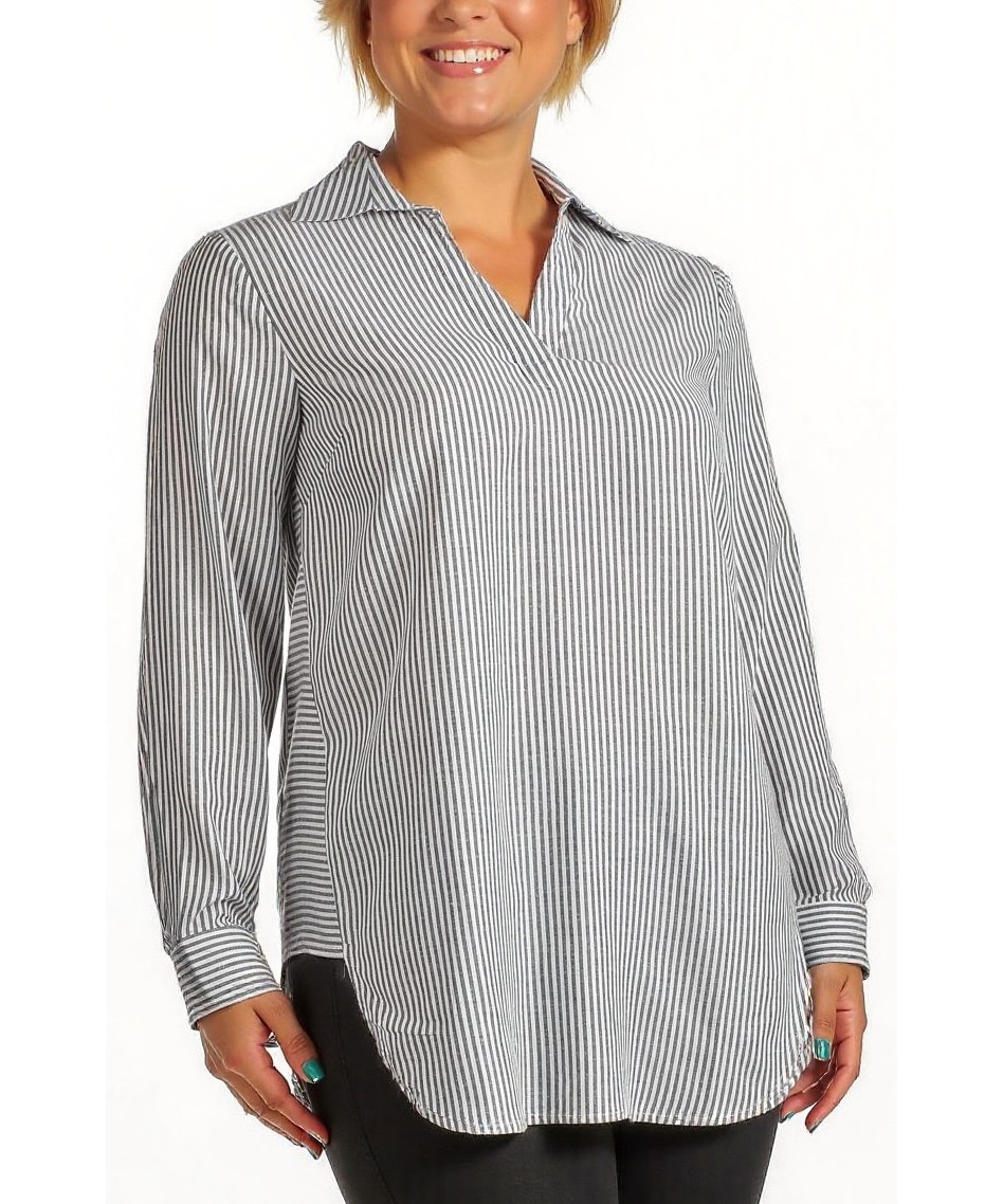 Елегантна дамска туника от 100% памук с нежни райета, V-образно деколте и яка. Свободна кройка, дълги ръкави и заоблен подгъв. Удобна, дишаща и лесна за поддръжка — идеална за всеки ден. Приятен допир