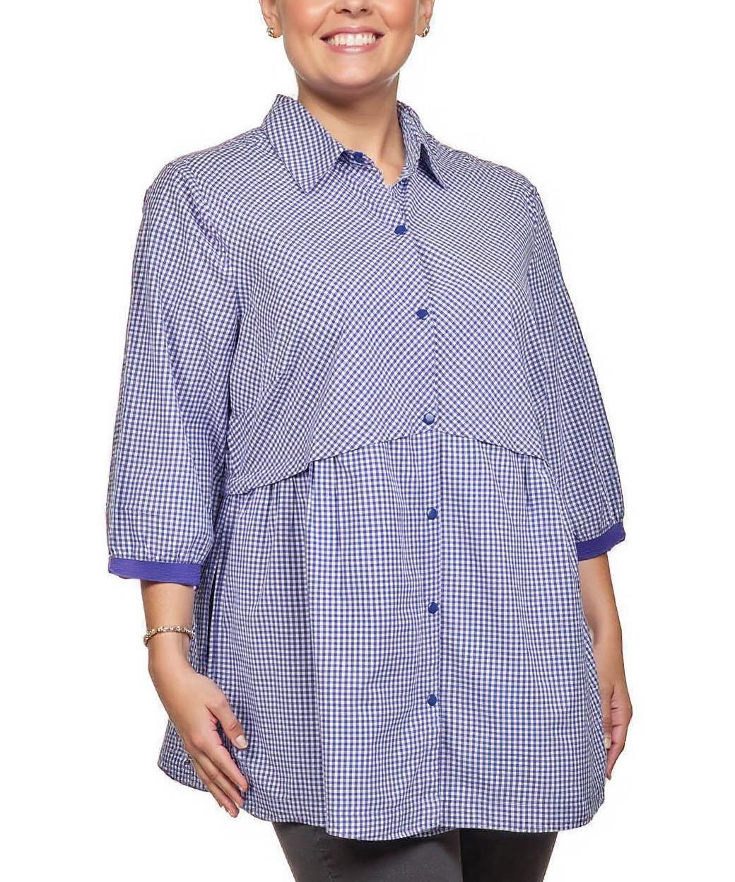 Дамска туника от памук с класически кариран десен. С три-четвърти ръкави и яка, предна закопчалка с копчета. Удобна и стилна за ежедневно носене, подходяща за всякакви поводи.