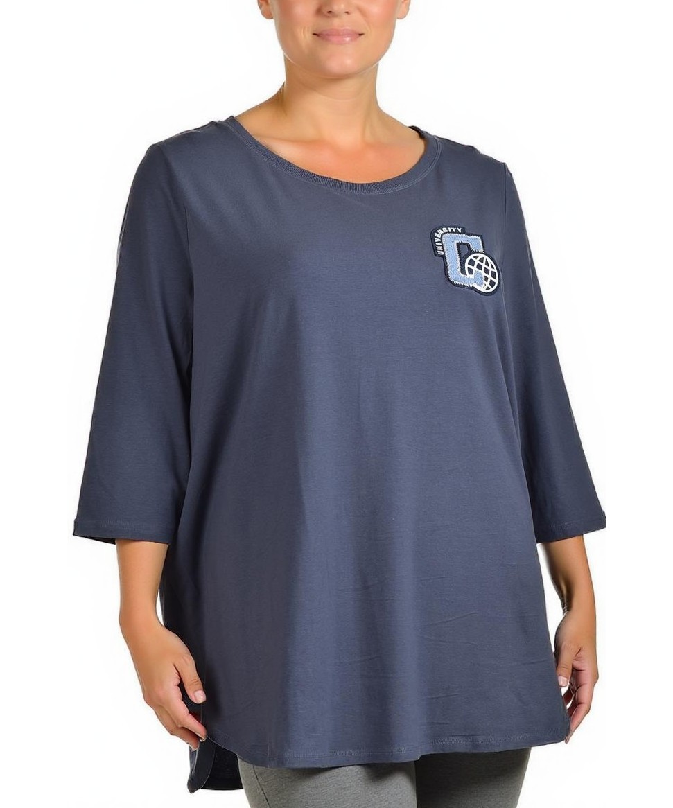 Дамска туника от 100% ПАМУК в тъмносин цвят. Свободна кройка с обло деколте и ръкави 3/4. Декорирана с малка емблема на гърдите и удължен гръб. Удобна за ежедневие, носи се с клин или дънки. Удобство.