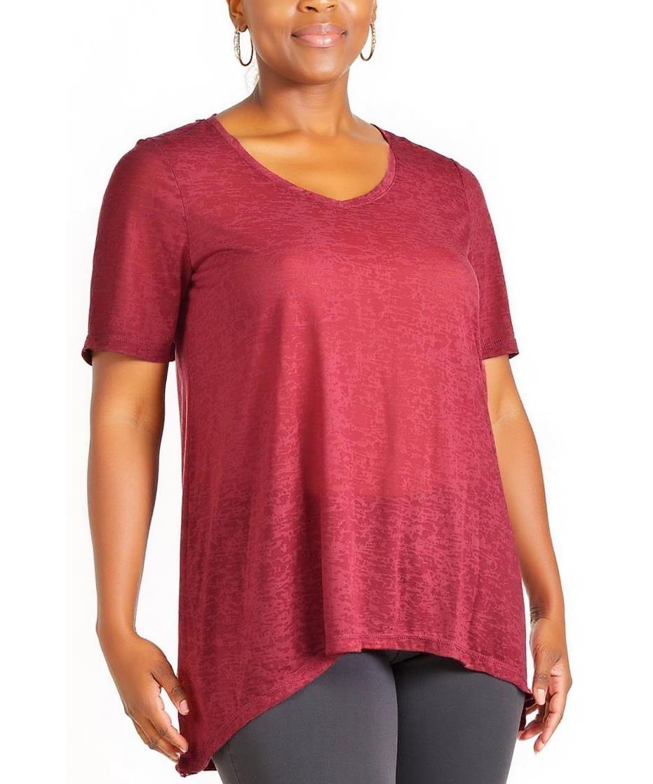 Дамска туника от ВИСКОЗА в бордо. Меко, дишащо трико, свободен силует. V-образно деколте, къс ръкав и асиметричен подгъв, по-дълъг отзад. Идеална за ежедневие с дънки или клин. Перфектна за всеки ден