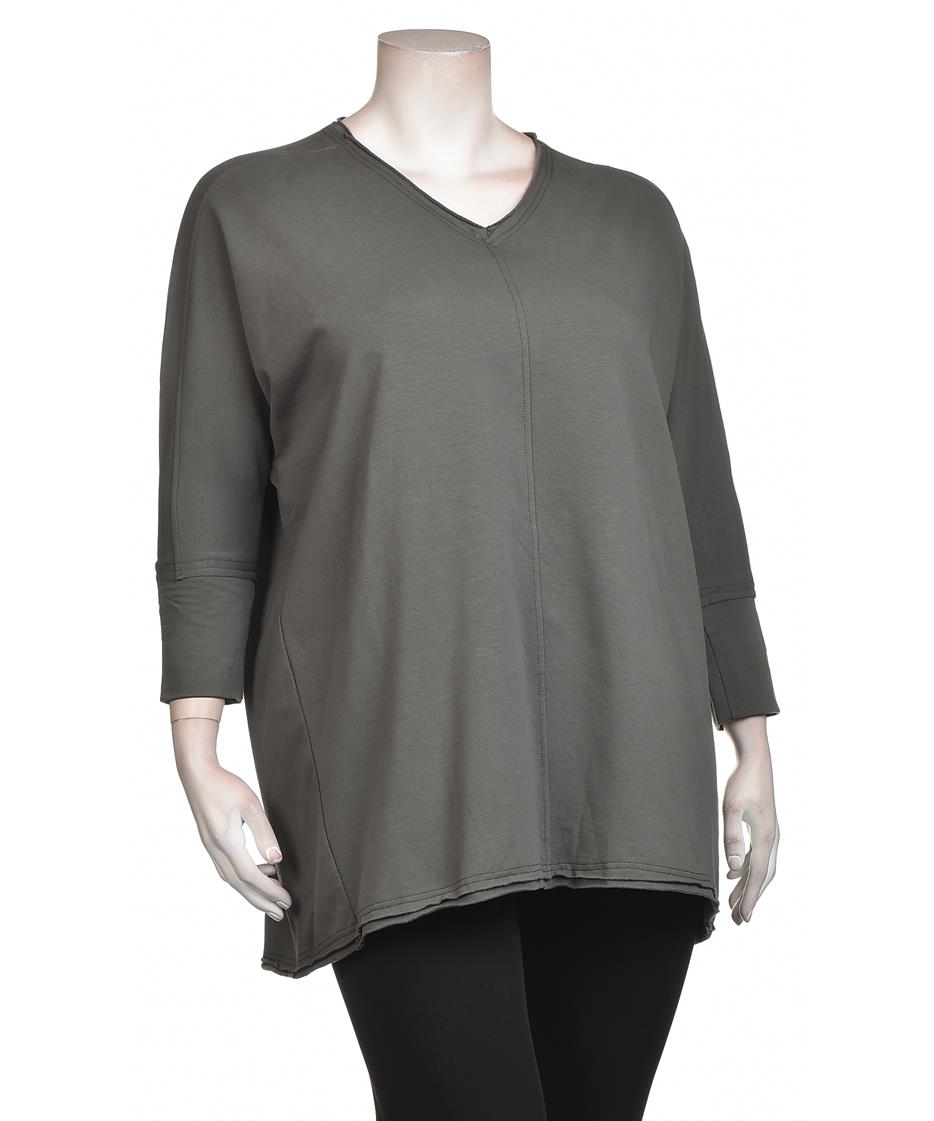 Мека дамска туника от 100% памук с V-образно деколте и свободен, удължен силует. Три-четвърт ръкави и дискретни шевове за ежедневен комфорт и елегантна небрежност. Пере в машина; налична в S-XL и XXL.