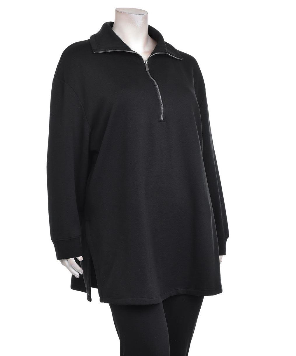 Дамска ватирана туника от памук, мека и топла. Свободен силует, дължина над ханша, поло яка с цип и странични цепки. Идеална за ежедневие и студено време. Цвят: черен.