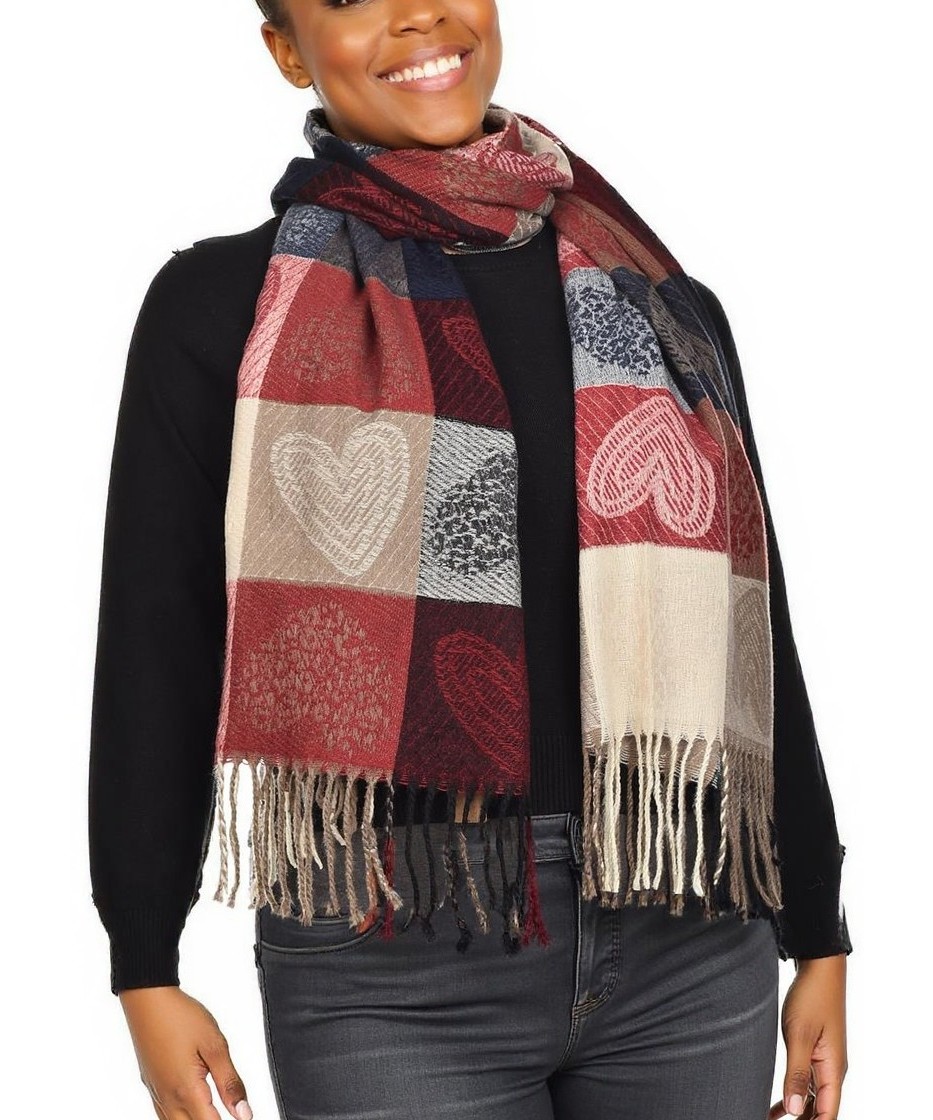 Дамски мек шал от 100% вълна с каре и сърца, топли богати тонове: бордо, беж, крем и тъмно синьо. Пухкав, с ресни, идеален за студено време и елегантни ежедневни визии. Подходящ подарък лесна поддръжка