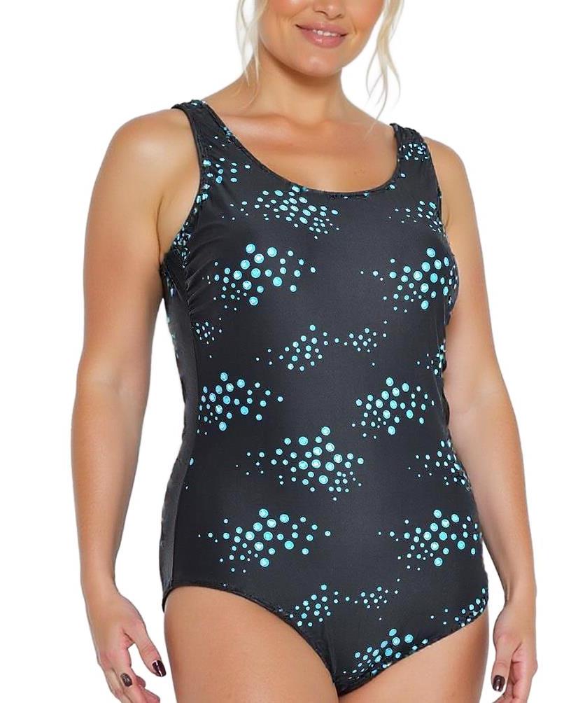Елегантен дамски бански костюм в цвят черен с абстрактни сини точки. Моделът е с цялостна конструкция и широки презрамки, осигуряващи комфорт и стил за плажни и басейнови изживявания.