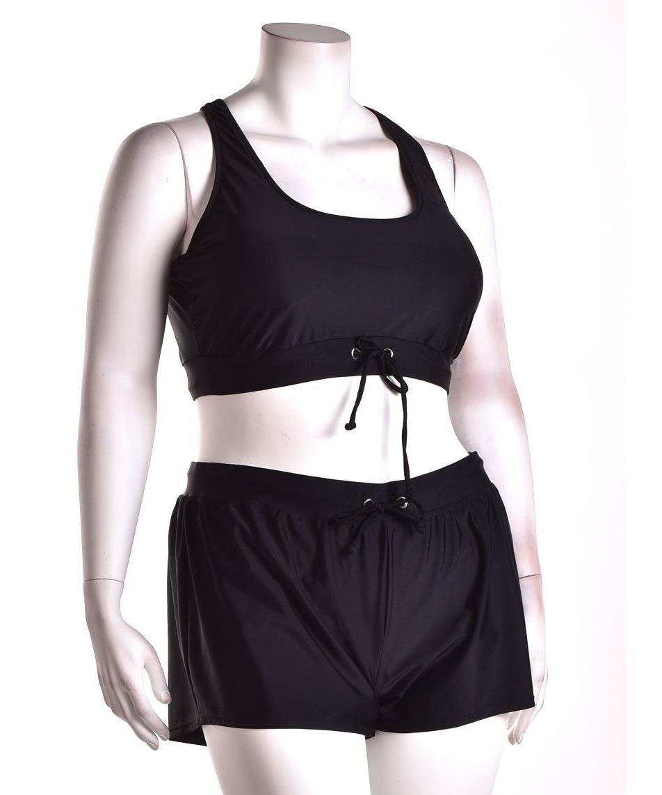 Дамски бански от две части в черен цвят, включващ спортен топ с дебели презрамки и връзка отпред. Долната част е със средна дължина, също с връзка за регулиране на талията. Подходящ за активно плажно ежедневие.