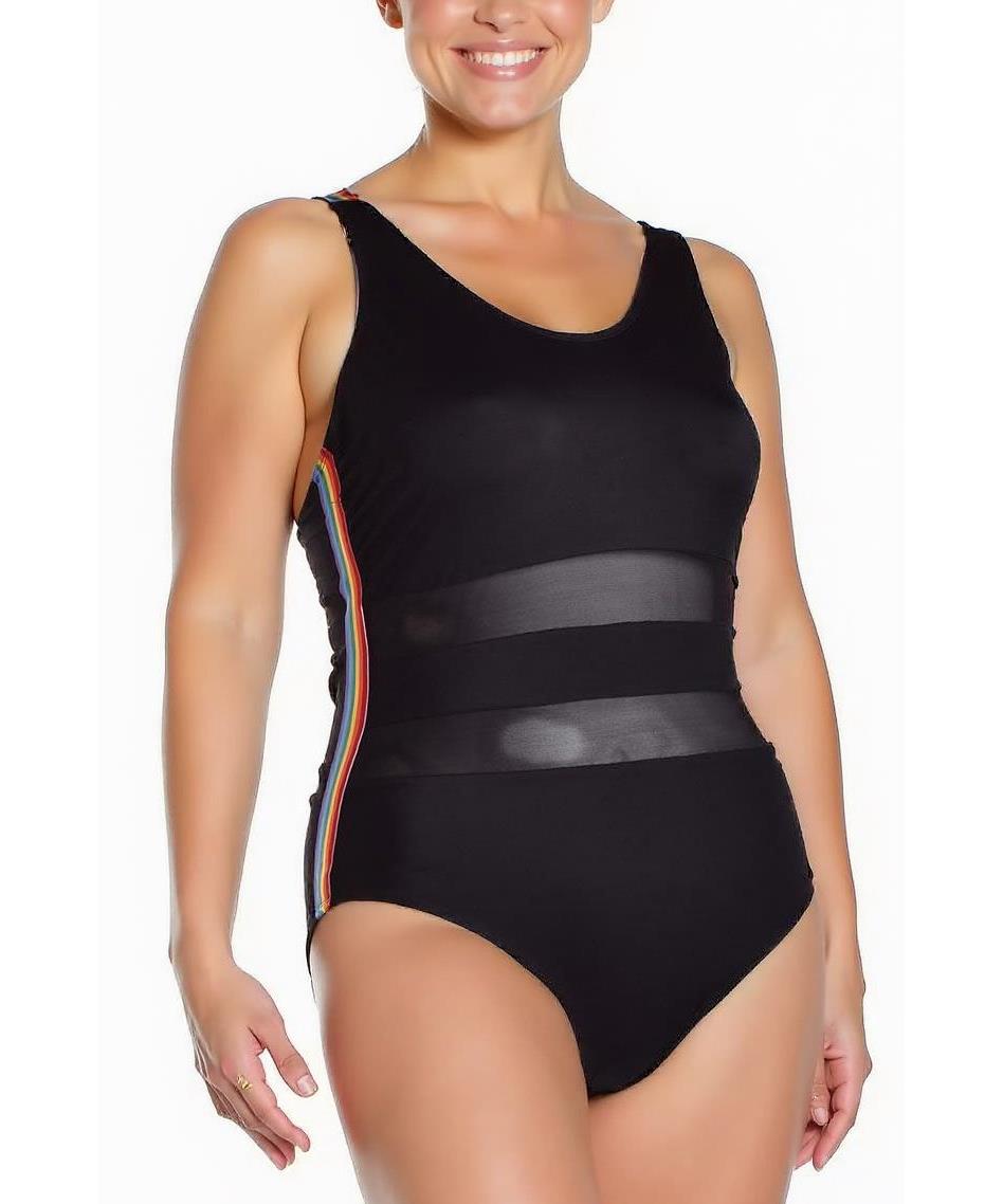 Дамски бански от едно цяло в черен цвят с прозрачни мрежести акценти в средната част. Има цветни ивици отстрани, придаващи модерен и свеж вид. Подходящ за плаж и басейн.