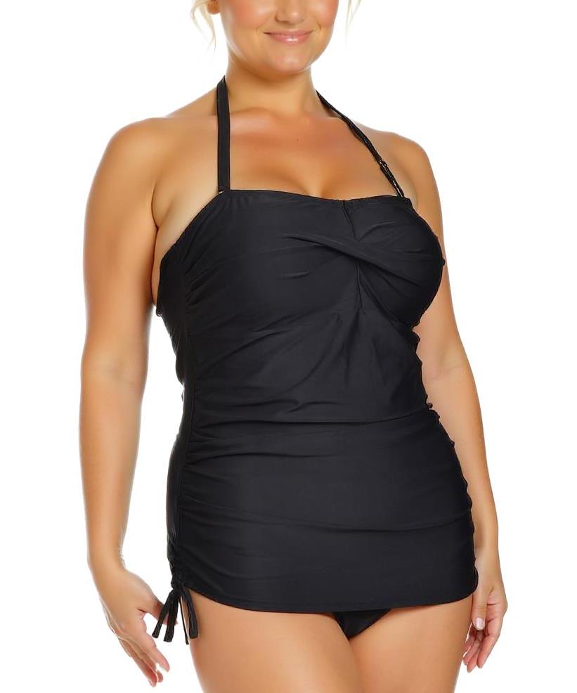 Дамски бански танкини, съставен от горна част с презрамка зад врата и долна част. Изработен е от черен плат с лек набор, който осигурява комфорт и стил. Идеален за плаж и басейн.