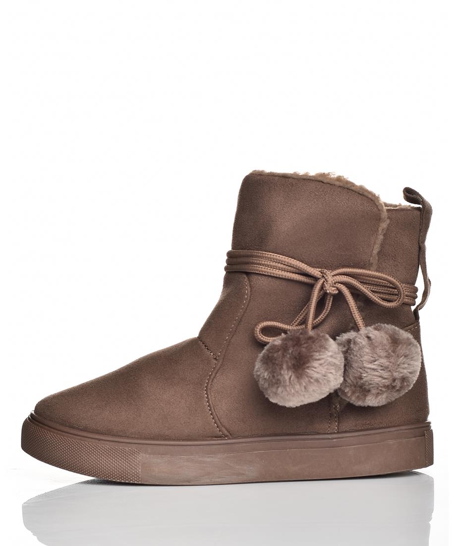 Дамски боти в кафяво от мек велур, със затопляща подплата и пухкави помпони. Плоска гумена подметка, лесно обуване, модерни и удобни за ежедневие и студено време. Топли и стилни идеални за зима сега
