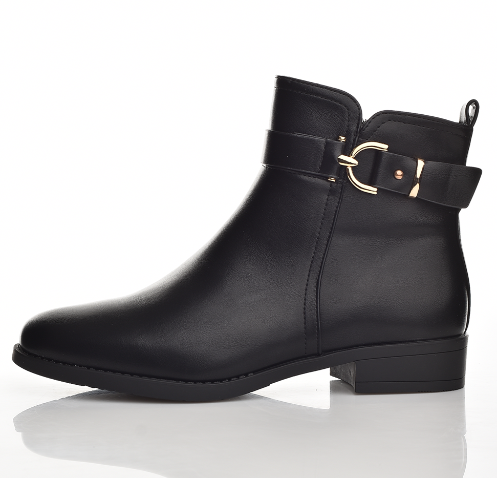 Елегантни дамски боти от еко кожа в класическо черно. Нисък каблук, удобна стелка и декоративна златиста катарама. Перфектни за ежедневието и офис визията. Подходящи за град и официални поводи.!!
