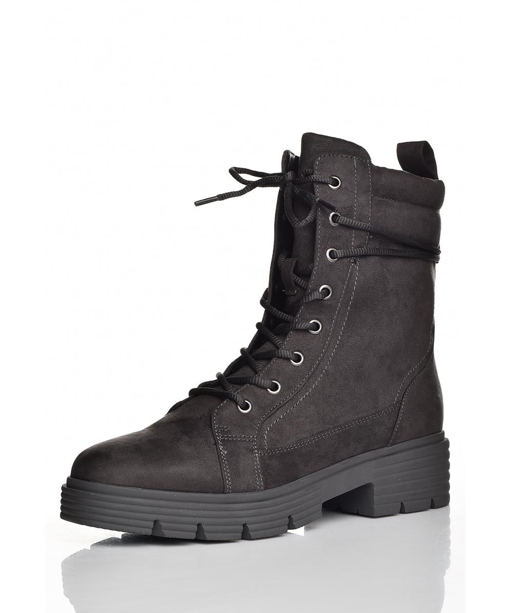 Стилни дамски боти от еко кожа в тъмносив цвят. Висока, удобна подметка с грайфер, връзки за перфектно напасване и мека вътрешна подплата. Перфектни за всекидневие. Лесни за комбиниране, подходящи за студ.