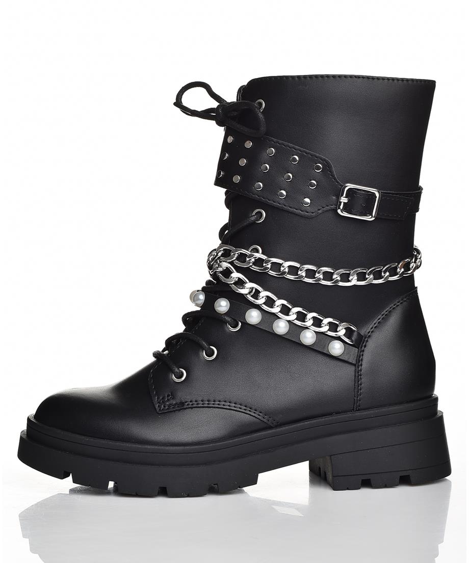 Дамски боти от еко кожа с груба подметка, връзки и катарама. Декоративни метални вериги, капси и перли придават стилен рокерски вид. Удобни и модерни за всеки ден. Лесни за съчетаване с дънки и рокли.!!