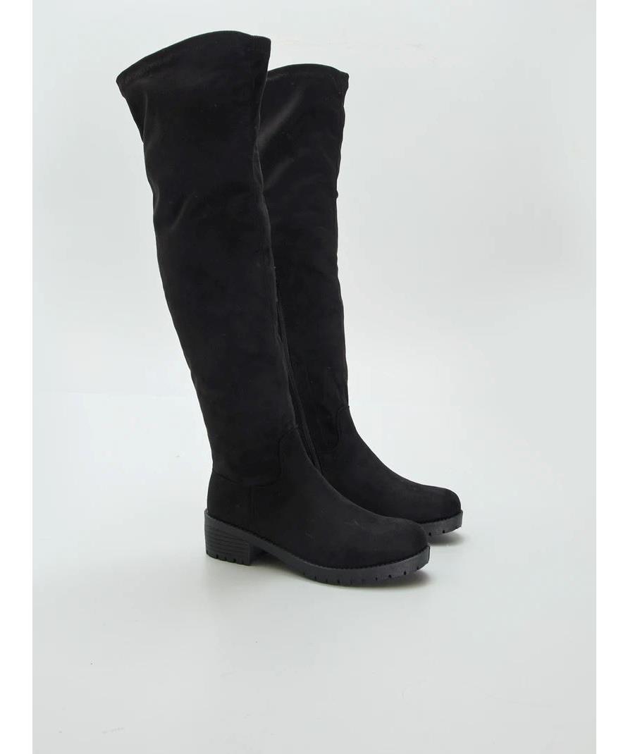 Елегантни дамски кожени ботуши над коляното в класическо черно. Мек външен вид, стабилен нисък ток, удобна подметка и изчистен силует – перфектни за ежедневие и специални поводи. Лесни за комбиниране.