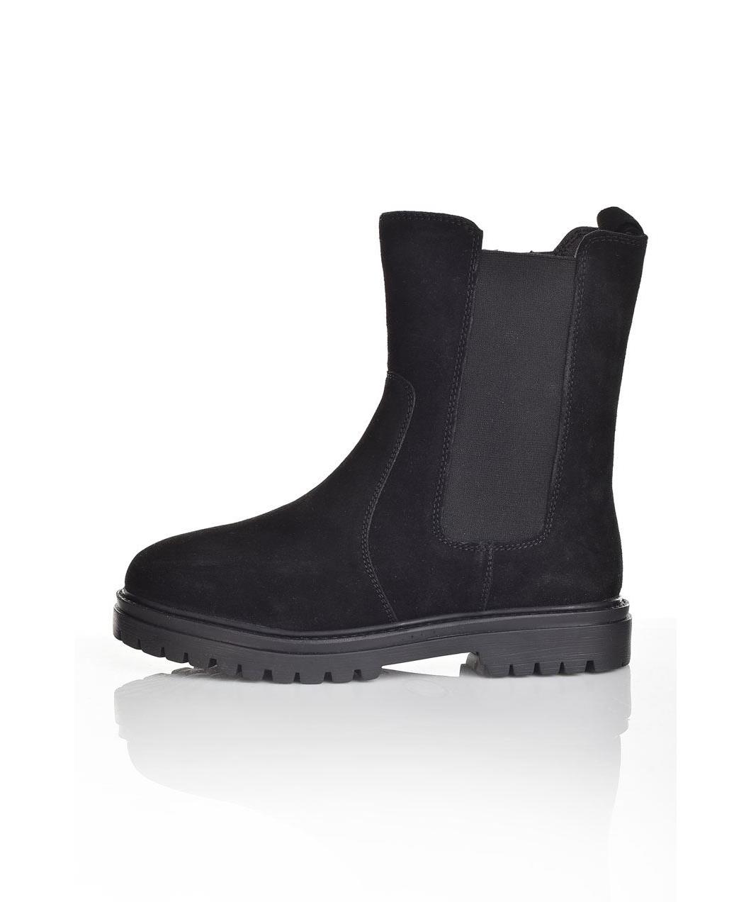Елегантни дамски кожени боти в черно с дебела грайферна подметка. Удобни, топли и модерни, с еластични платки за лесно обуване. Подходящи за ежедневие и студено време. Изчистен дизайн, лесна поддръжка