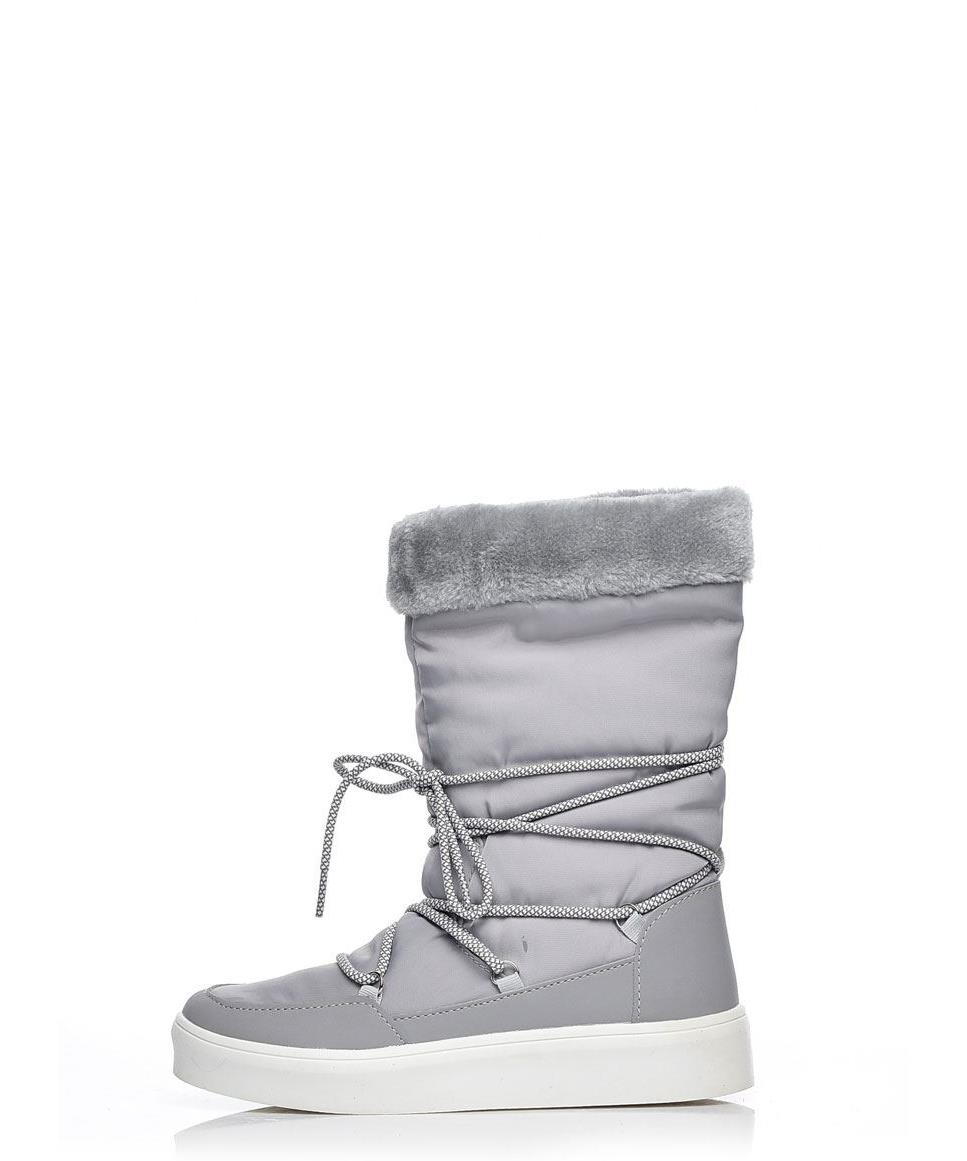 Стилни дамски ботуши от кожа, средно дълги, в сив нюанс. Пухен подгъв, топла подплата и дебела бяла подметка. Удобно връзване с въжета за сигурно прилепване. Перфектни за студено време. Стилен избор!!!
