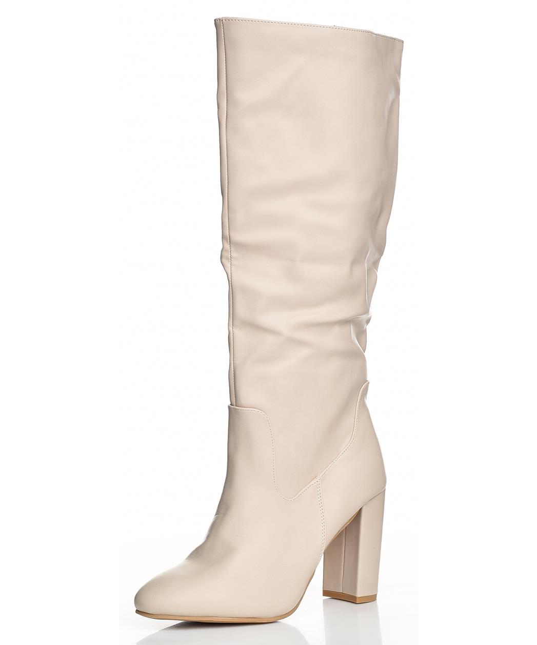 Елегантни дамски ботуши от еко кожа в кремав нюанс. Висок ботуш с модерен блок ток, заоблен връх и нежни набръчквания по халката. Удобни, стилни и подходящи за есенно-зимни визии. Подходящи всеки ден.