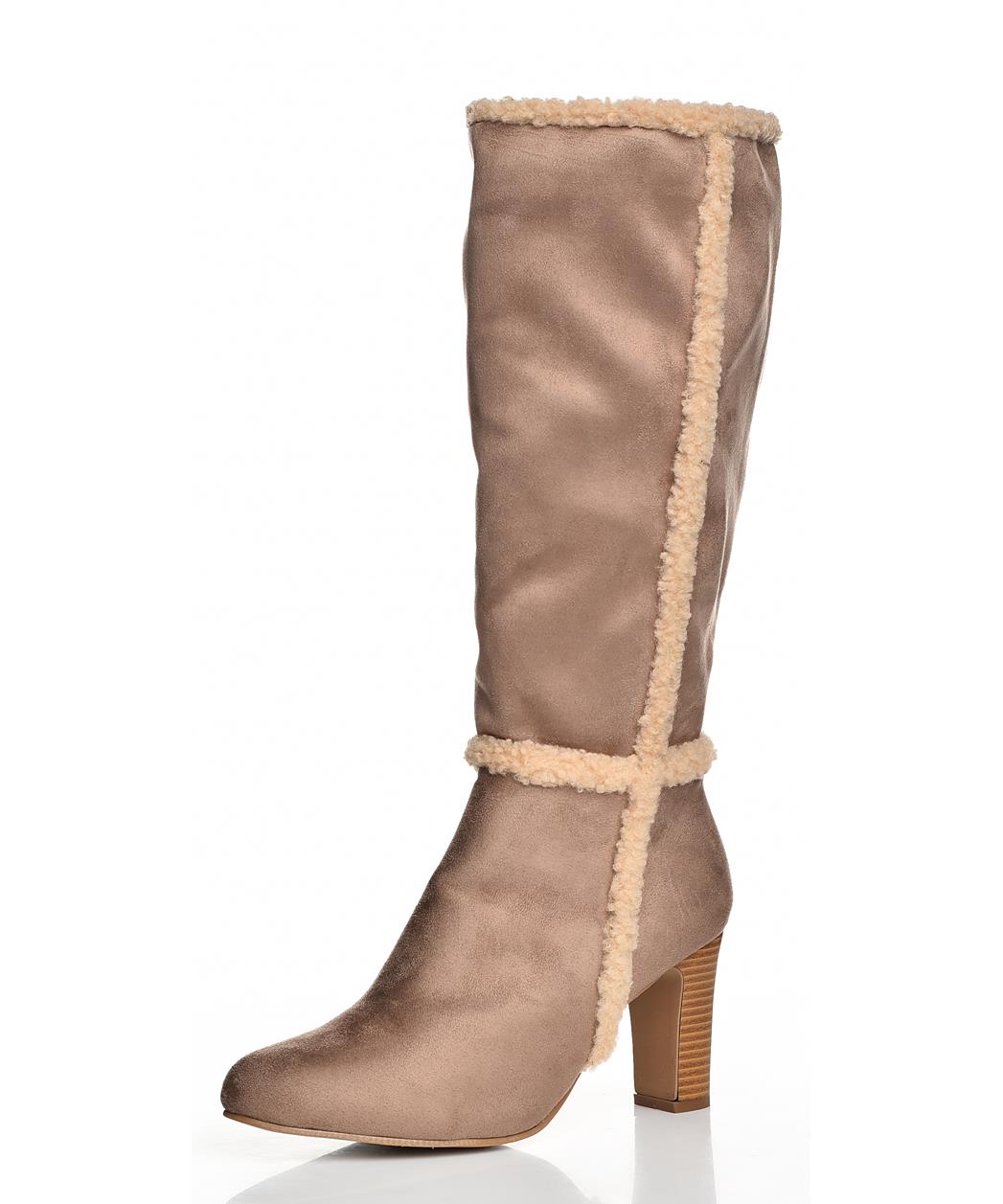 Дамски високи ботуши от еко кожа в бежово с мека подплата от изкуствена вълна. Стилни, с удобен широк ток, топли и подходящи за ежедневно носене и по-официални визии. Лек ход, стабилна подметка, лесна.