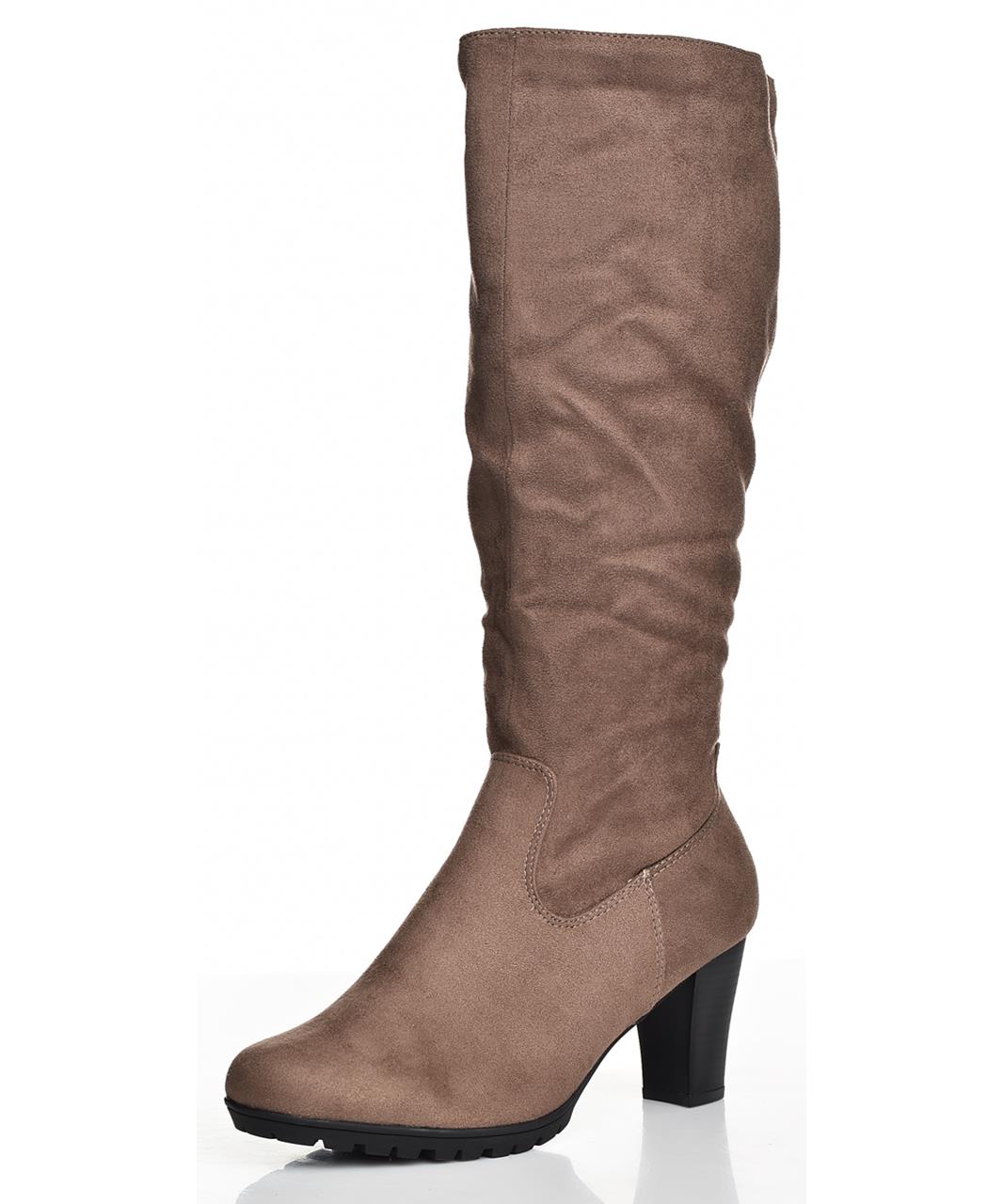 Елегантни дамски ботуши от еко кожа в кафяво, с висока подбедрица и стабилен ток 8 см. Удобни топли и модерни — перфектни за ежедневно носене и официални поводи. Вътрешна подплата и устойчиво ходило. Еко