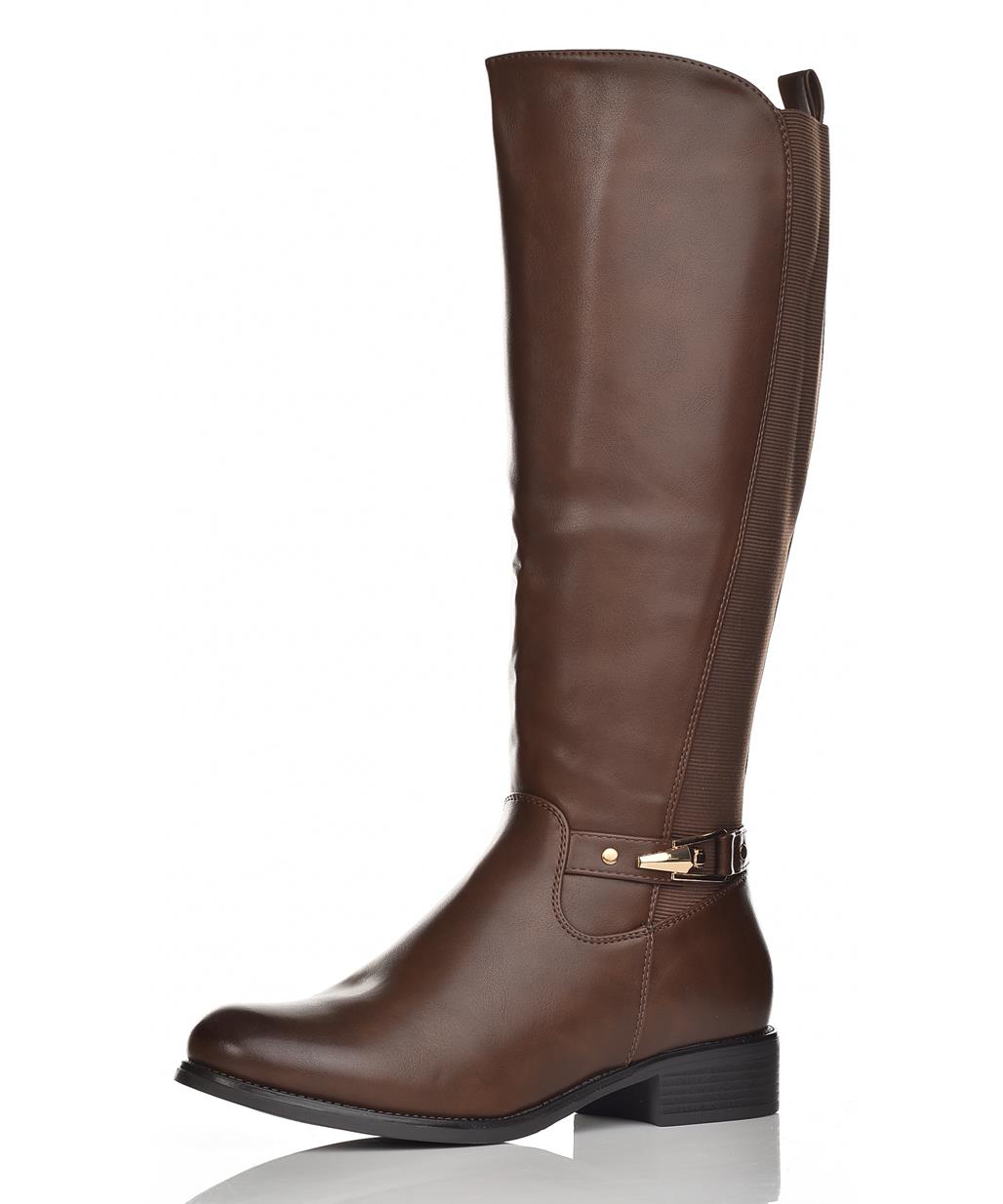 Елегантни дамски ботуши от еко кожа в тъмен кафяв цвят, с висока телесна част и удобен нисък ток. Стилен детайл с метална катарама, топли и удобни за ежедневие и официални визии. Лесни за поддръжка.!!