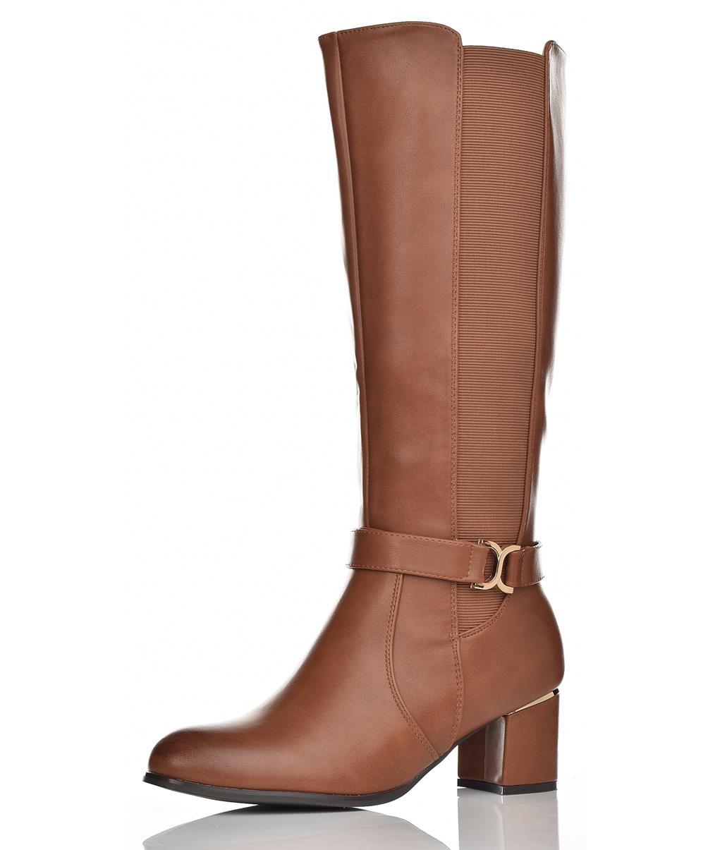 Кафяви дамски ботуши от еко кожа до коляно, със странична еластична лента и декоративна метална катарама. Среден блок ток за комфорт, стилни и лесни за комбиниране във всеки градски гардероб. Класични.