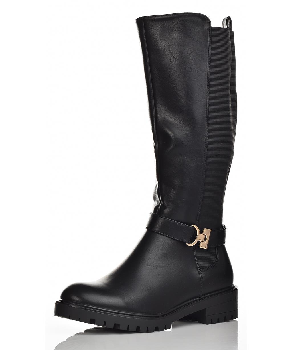 Дамски високи ботуши от еко кожа с еластична панта и декоративна метална катарама. Солидна грайферна подметка за стабилно ходене. Удобни, стилни и идеални за всеки ден. За ежедневни и празнични визии....