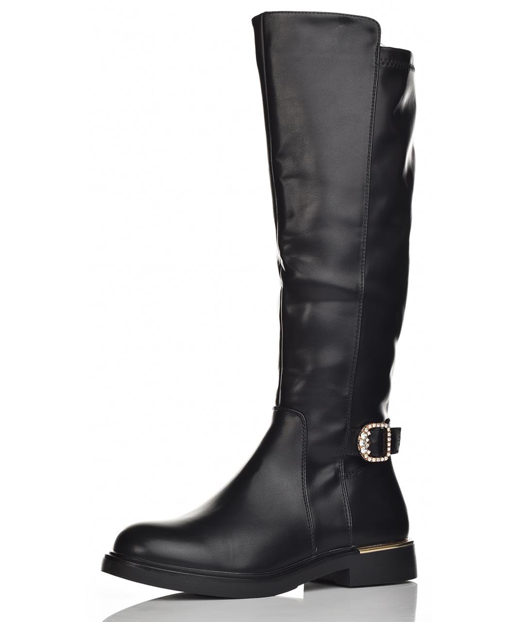 Дамски ботуши от еко кожа в елегантно черно, до коляното. Мек, хастар, стабилен нисък ток, декоративна катарама с камъни и златист акцент. Удобни и стилни за всеки ден. Предлагат се в различни номера.