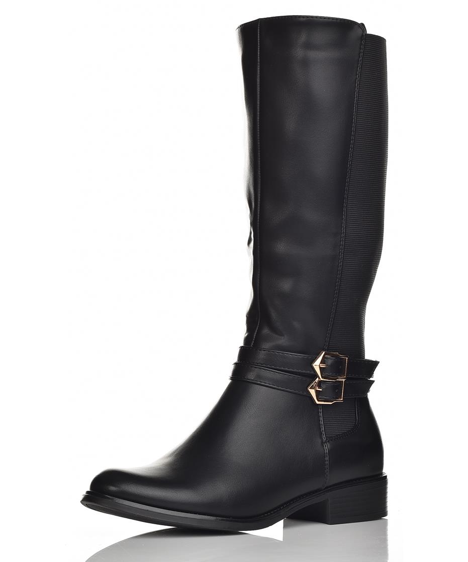 Елегантни дамски ботуши от еко кожа в черно. Висока халка, декоративни две каишки с метални катарами, удобен нисък ток и гладка линия за стилен външен вид през есента и зимата. Подходящи за всеки ден.