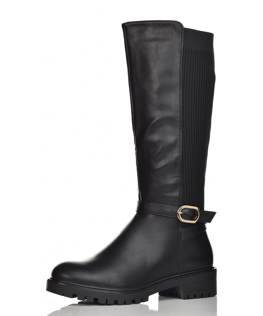 Черни дамски ботуши от еко кожа с еластична плетена част на прасеца, златиста катарама и грапава подметка. Комфортни, водоустойчиви и стилни за ежедневие и по-елегантни визии. Подходящи за студ и сняг.