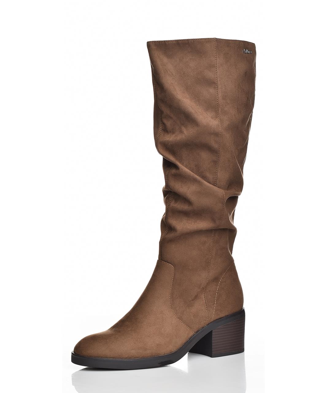 Дамски високи ботуши от еко кожа в кафяв нюанс. Стилен намачкан дизайн, удобен широк среден ток и закръглен връх. Подходящи за ежедневие и елегантни визии, с меко вътрешно покритие. Подсилена подметка