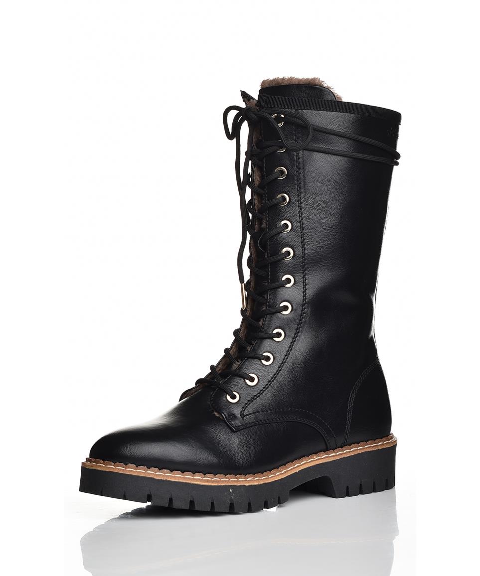 Дамски високи боти от еко кожа: стилни черни, връзки до прасец, топъл хастар, грайферна подметка за стабилно сцепление и контрастен кант. Удобни за зимни и градски визии. Леки и удобни, налични до 42.