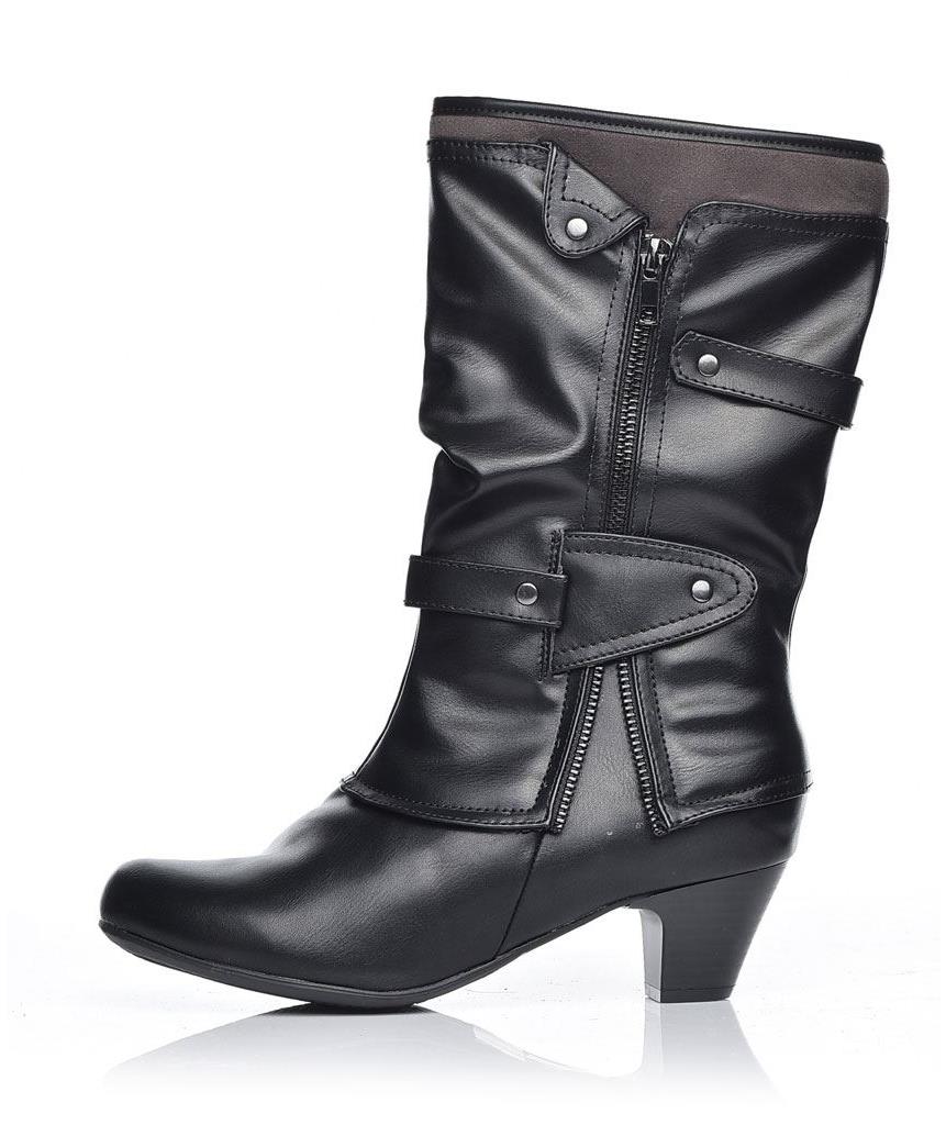 Дамски кожени ботуши в елегантно черно, среден ток и удобна форма. Декоративни каишки и цип, мека вътрешна подплата, стабилна подметка. Стилен избор за офис и свободно време. С подвижна стелка удобно.